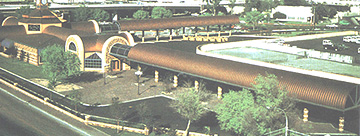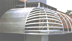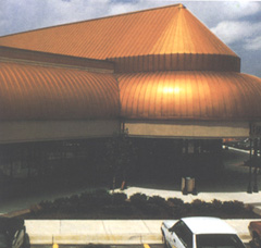 圆弧形T型建筑金属面板所建造的美丽外形,以 SS-14携带式成型机加工成型,配合各种外形设计创造出既经济又引人侧目的建筑艺术。 此为拱形屋顶走廊雨遮完工实例。