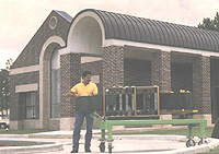 淀钢国际公司提供美国贝里奇公司建筑用金属面板系统主体,图为携带式成型机 SS-14 现场成型状况